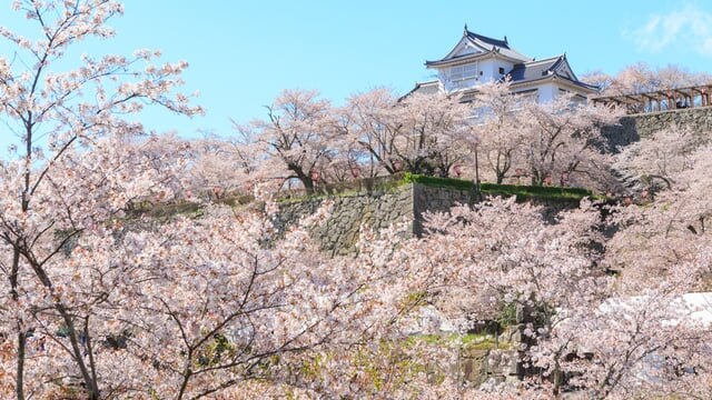 El sitio del castillo, ahora conocido como Parque Kakuzan, alberga aproximadamente 1000 cerezos, creando una exhibición espectacular durante el pico de floración en abril. Si bien del castillo original solo queda la torre reconstruida de Bitchu Yagura, la vista de los altos muros de piedra que se asoman a través de los cerezos en flor es una escena impresionante.
