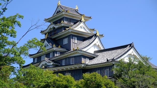 Apodado "Ujō" (Castillo de los Cuervos) por sus llamativas paredes negras, el Castillo de Okayama fue construido originalmente por Ukita Naoie, un señor de la guerra del período Sengoku, y más tarde se convirtió en la residencia del clan Ikeda durante el período Edo. Aunque la torre del castillo actual es una reconstrucción de posguerra, su exterior negro y sus shachihoko dorados (tejas ornamentales) destacan maravillosamente contra el cielo de Okayama.