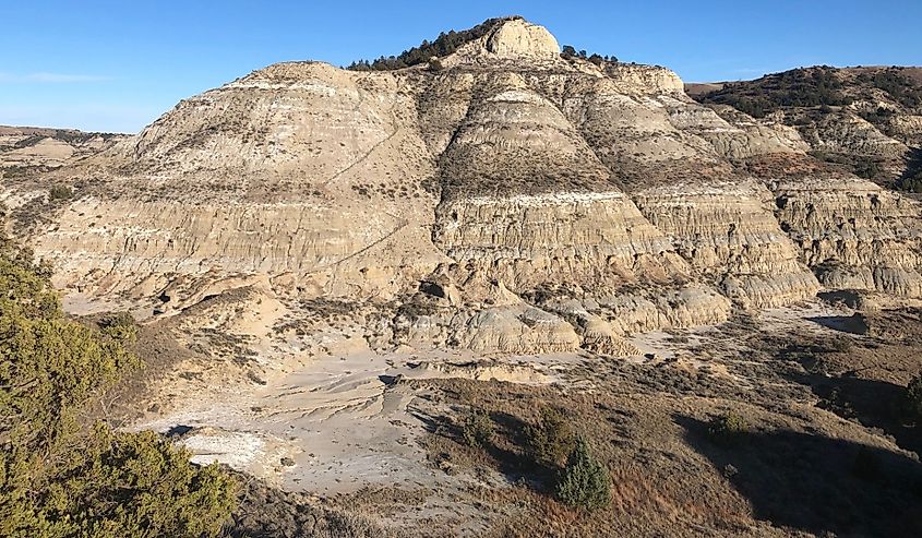 White Butte, que se eleva 3506 pies sobre el nivel del mar, es el punto natural más alto de Dakota del Norte. Ubicada en el condado de Slope, dentro de las escarpadas Badlands, esta impresionante loma ofrece a los excursionistas un gratificante viaje de ida y vuelta de 4 millas hasta la cumbre con amplias vistas de la pradera nacional Little Missouri. El sitio es propiedad privada de la familia Dennis, quienes mantienen el área y solicitan una pequeña donación a los visitantes para ayudar con el mantenimiento.