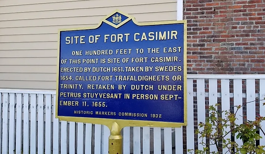 Construido por los holandeses en 1651 en lo que hoy es New Castle, Fort Casimir rápidamente se convirtió en un punto álgido en la lucha por el control del río Delaware. Unos años más tarde, los colonos suecos del cercano Fuerte Christina lo capturaron y lo rebautizaron como Fuerte Trefaldighet o Fuerte Trinidad. En 1655, Peter Stuyvesant, un gobernador colonial holandés, había reclamado el fuerte, solo para que luego cayera en manos inglesas en 1664. Su captura aseguró el dominio inglés sobre el valle de Delaware y marcó el fin de la efímera colonia de Nueva Suecia en la región.