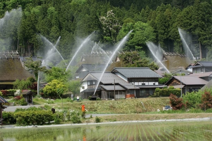 La imagen muestra un simulacro de prevención de desastres que también funciona como inspección de cañones de agua. Para proteger las casas con techo de paja del fuego, desde el año 2000 se realiza un evento de rociado de agua a gran escala dos veces al año, en primavera y otoño. "Miyama Kayabuki no Sato", donde se pueden contemplar los nostálgicos paisajes de Japón, es un lugar relajante que atrae a muchos visitantes durante todo el año.