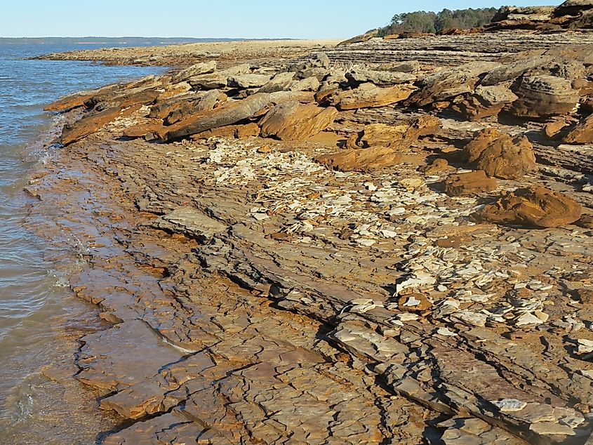 Playa de arcilla a lo largo del lago Grenada en Grenada, Mississippi.