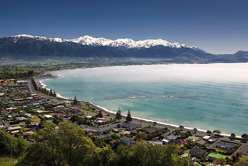 Municipio de Kaikoura, con niebla matutina despejada, Isla del Sur, Nueva Zelanda