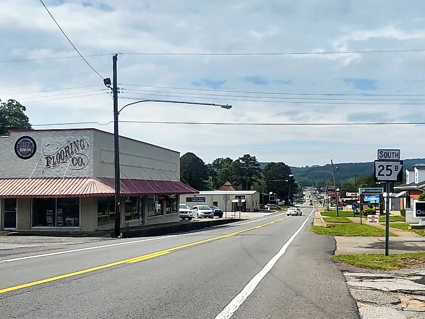 Vista a nivel de calle de Main Street (Mena Street) en Mena, Arkansas, con los colores otoñales de Rich Mountain al fondo, capturando la esencia de un pequeño pueblo de Estados Unidos. Pie de foto: Main Street en Mena, Arkansas. Crédito editorial: Gina Santoria / Shutterstock.com