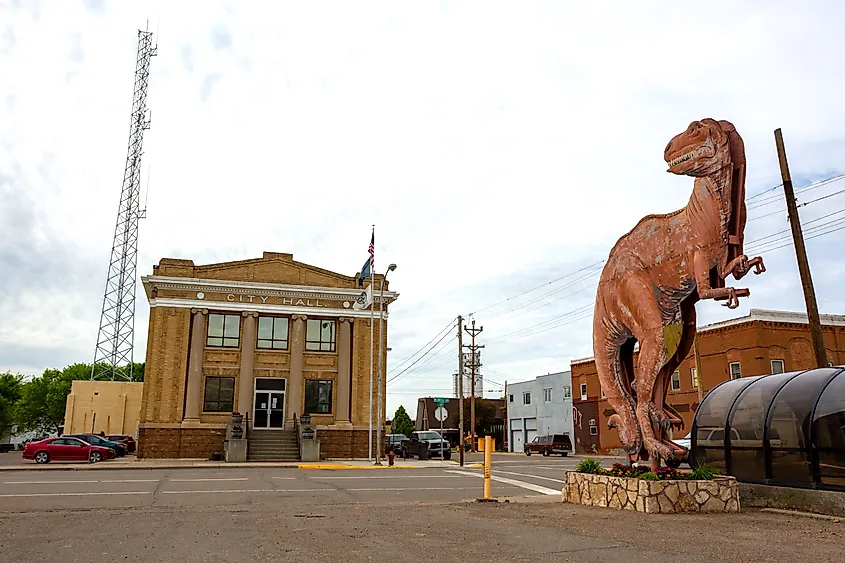 Una estatua de dinosaurio junto al Ayuntamiento de Glendive, Montana. Crédito editorial: Logan Bush / Shutterstock.com.