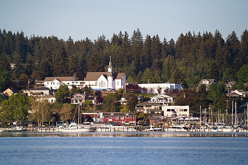 La antigua iglesia se alza sobre la pintoresca ciudad de Poulsbo en el estado de Washington.