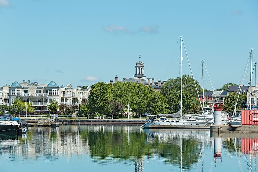 Vista del puerto deportivo de Cobourg y la torre del reloj Victoria Hall en Cobourg, Ontario. Crédito de la imagen Roy Harris a través de Shutterstock