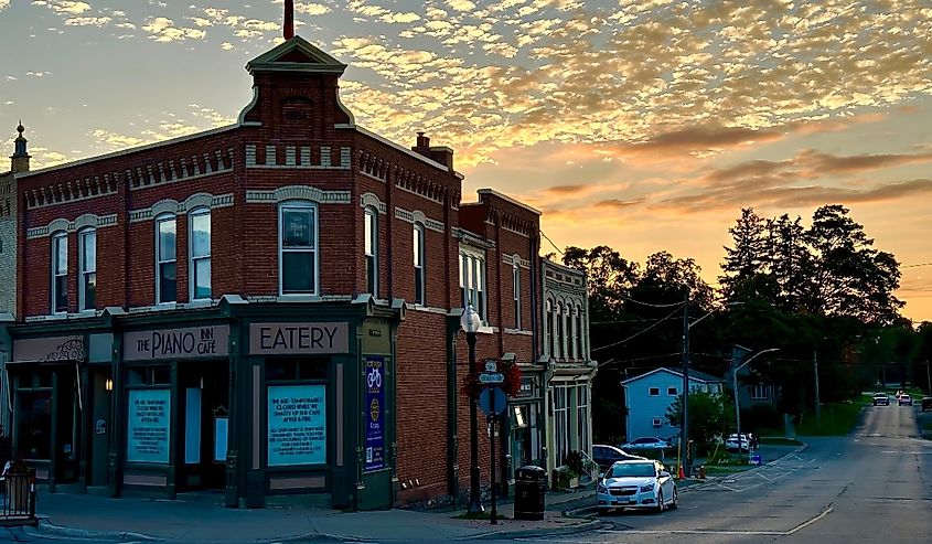 Edificio histórico en esquina con una impresionante fachada al atardecer con pequeñas nubes en Port Perry, Ontario. Crédito de la imagen oliverdelahaye a través de Shutterstock