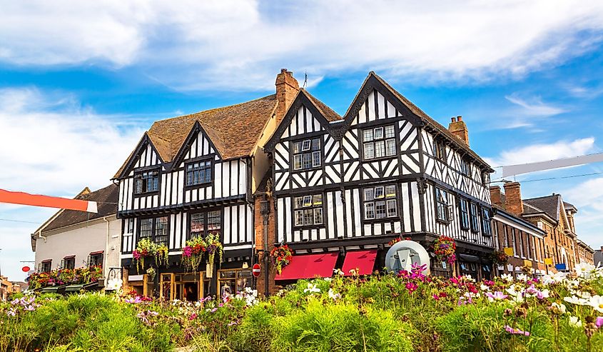 Casa con entramados de madera en Stratford upon Avon, Inglaterra, Reino Unido, con flores y vegetación en primer plano