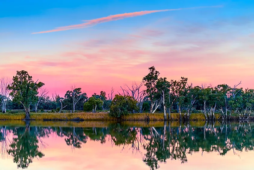 Las orillas del río Murray se reflejan en el agua al atardecer (región de Riverland, Australia del Sur)