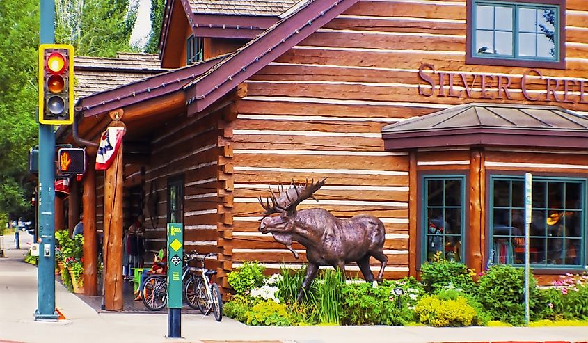 Esquina de la calle del centro de Ketchum, Idaho, con tienda de cabañas de madera y escultura de alce cerca de Sun Valley. Crédito de la imagen Susan Vineyard a través de stock.adobe.com