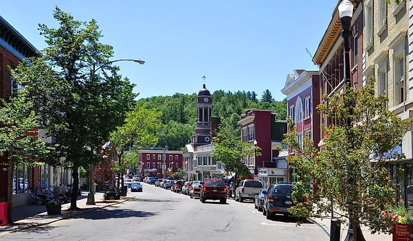 Main Street en el pueblo de Saranac Lake en las montañas de Adirondack, Nueva York. Crédito de la imagen Wangkun Jia a través de Shutterstock