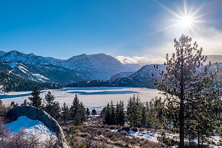 Un June Lake parcialmente congelado en la ciudad de June Lake, California.