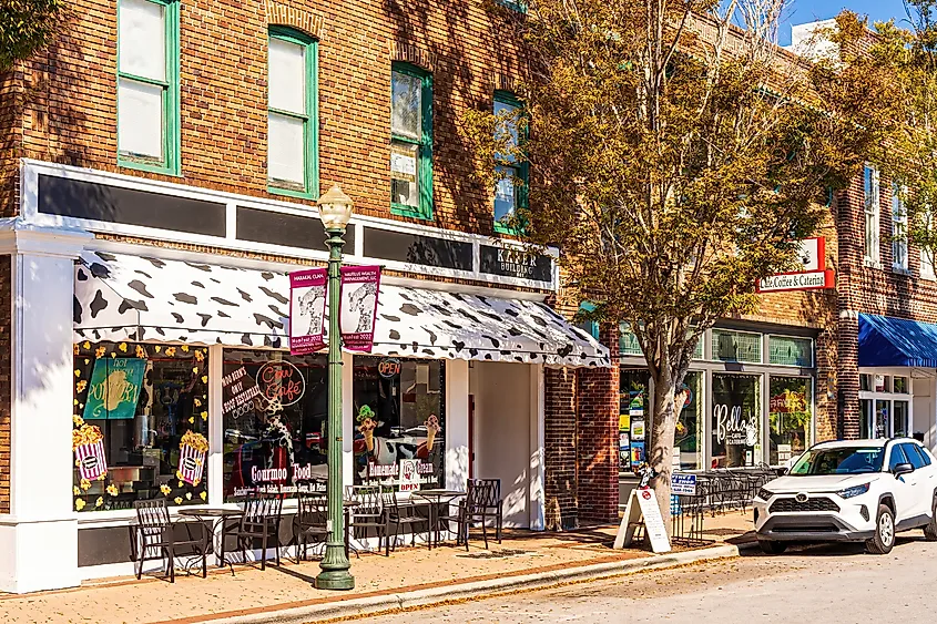 Un café popular en el área histórica de New Bern está a la sombra de los árboles. Crédito editorial: Wileydoc / Shutterstock.com