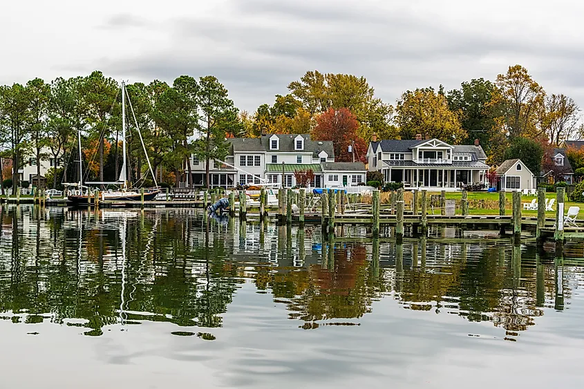 Casas frente al mar a lo largo del puerto en St. Michaels, Maryland.