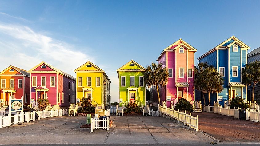 Una hilera de coloridas casas frente al mar en una tarde soleada en St. George Island, Florida. Crédito de la imagen HJ Herrera a través de Shutterstock