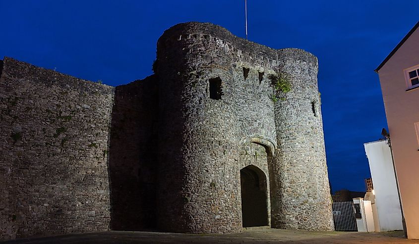 Castillo de Carmarthen por la noche. Hecho de piedra y cielo azul de fondo. Crédito de la imagen Billy Stock a través de Shutterstock
