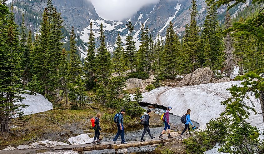 Un pequeño puente peatonal cerca del Lago Emerald, el Parque Nacional de las Montañas Rocosas, Estes Park, Colorado. Crédito de la imagen Sean Xu a través de Shutterstock