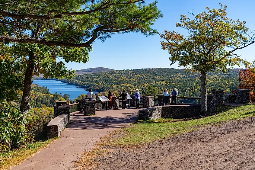 Los turistas disfrutan de la vista desde Brockway Mountain Lookout en Copper Harbor, Michigan. Crédito de la imagen Melissamn a través de Shutterstock