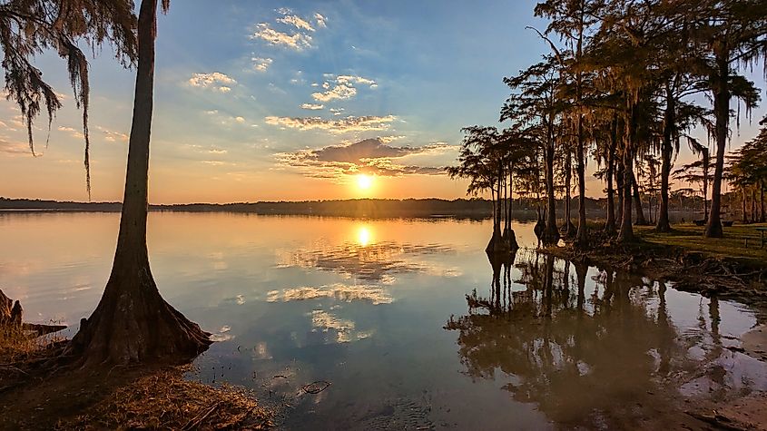 Los cipreses y el lago Jackson al atardecer desde el Parque Estatal Florala en Florala, Alabama. Crédito de imagenFisherbray a través de Flickr.com
