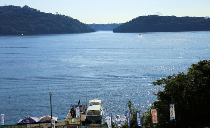 El área de embarque para el recorrido en bote “Sea Lake” se encuentra a la orilla del lago, justo debajo de la plaza. Al otro lado del agua, los visitantes también pueden ver el parque de atracciones Kanzanji, con su noria como punto de referencia.