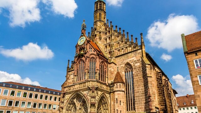 Frente al Hauptmarkt en el centro de Nuremberg, la Frauenkirche (Iglesia de Nuestra Señora) es una iglesia de estilo gótico construida por el emperador Carlos IV del Sacro Imperio Romano a mediados del siglo XIII. La sencilla fachada gótica de la iglesia realza su majestuosa presencia.