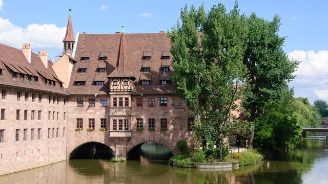 Uno de los lugares turísticos más famosos de Nuremberg para la fotografía, el Heilig-Geist-Spital (Hospital del Espíritu Santo) es particularmente conocido por su paisaje pintoresco. El edificio se extiende a lo largo de una isla en el río Pegnitz, dando la impresión de que flota sobre el agua, creando una imagen sorprendente.