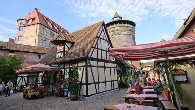 Justo afuera de la estación central de Nuremberg, a través de la puerta Königstor, encontrarás el Patio de los Artesanos, una réplica de una ciudad medieval alemana. Aquí, auténticos artesanos conocidos como “Meisters” se reúnen para vender productos artesanales como joyas, productos de cuero y bolsos, perfectos para comprar souvenirs. Los visitantes también pueden disfrutar de las salchichas de hierbas especiales de Núremberg y platos de temporada como los espárragos blancos, lo que lo convierte en un lugar ideal para aquellos que desean experimentar un ambiente medieval.