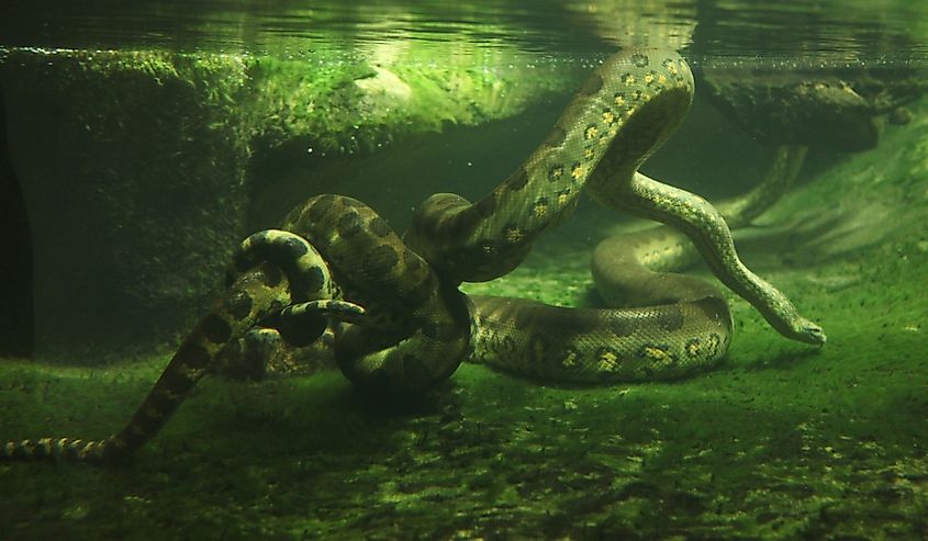 Anaconda verde (Eunectes murinus) nadando bajo el agua.