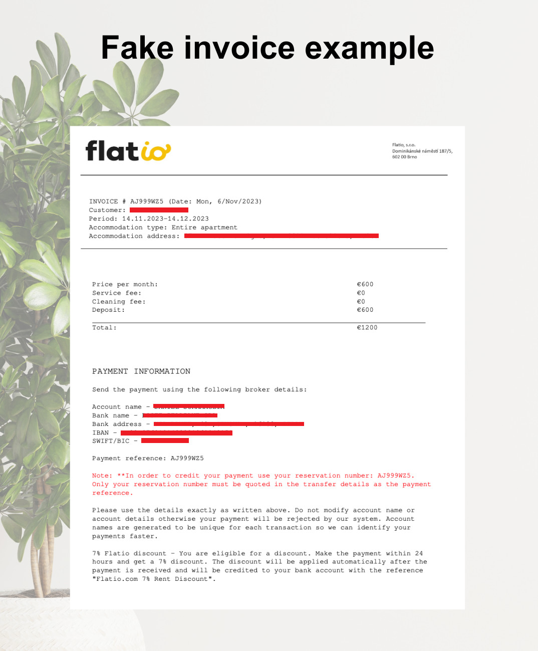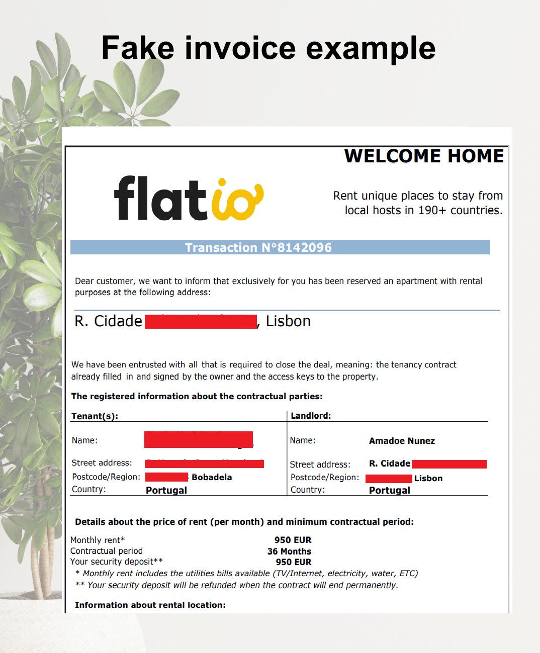 Los estafadores no sólo pidieron a algunos huéspedes potenciales que transfirieran dinero por servicios inexistentes, sino que también recibieronfacturas falsasconNombre y logo de Flatio.