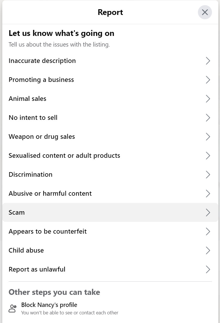 Como se puede ver en las capturas de pantalla a continuación,los usuarios pueden reportar fácilmente una lista sospechosahaciendo clic en “Listado de informes" y luego informarlo como "Estafa“. También puedenreportar perfiles sospechososhaciendo clic en “InformeBotón ”(ver más abajo).
