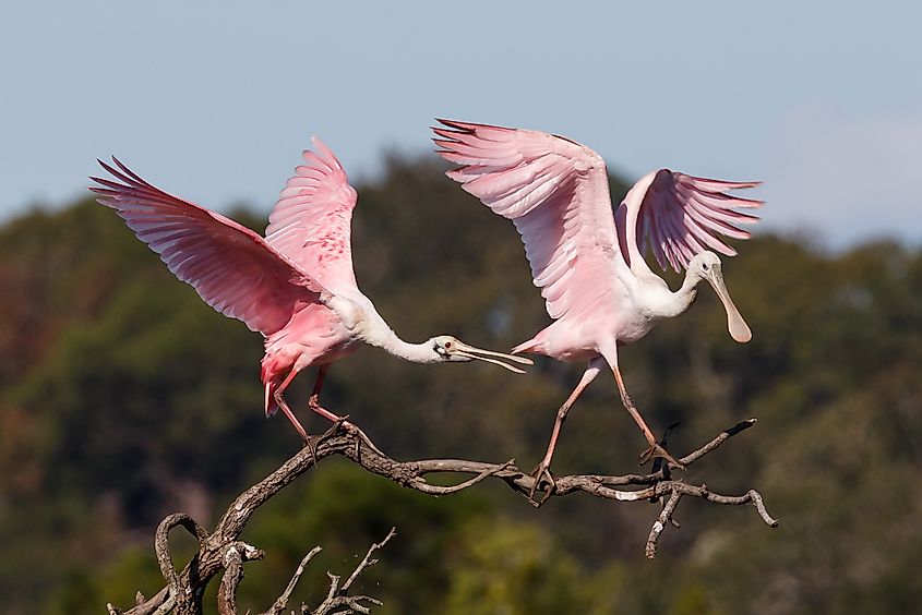 Estas majestuosas aves rosadas y blancas habitan en los manglares del sur de Florida, la costa de Texas y el suroeste de Luisiana. Tienen un pico distintivo en forma de cuchara, de ahí el nombre, y lucen un plumaje rosa claro exquisito que luce aún más impresionante cuando extienden las alas. Utilizan sus picos en forma de cuchara para recoger insectos, pequeños moluscos y plantas de aguas poco profundas. Los científicos creen que obtienen su color de su dieta constante de crustáceos.