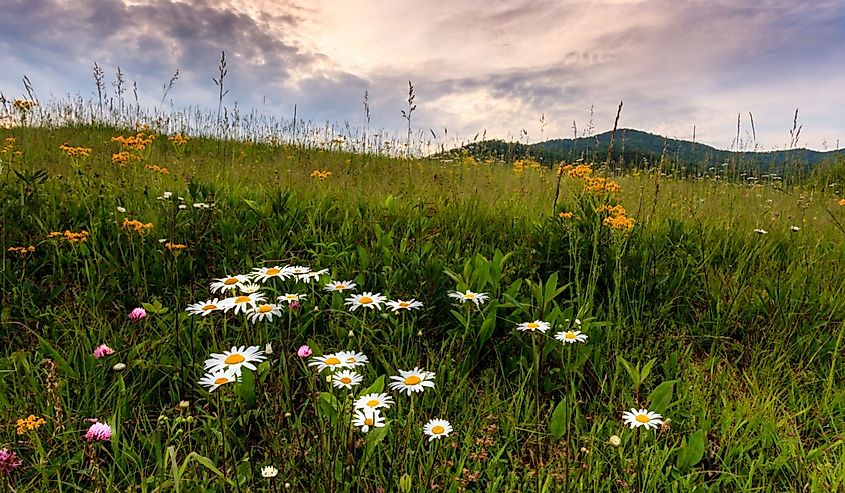 Pradera con flores silvestres en Cades Cove, parque nacional Great Smoky Mountains con cielo al atardecer