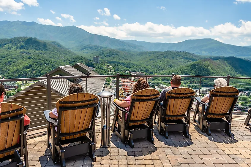 Los turistas se sientan en las sillas al aire libre en Gatlinburg Skydeck, frente a la mejor vista de las Grandes Montañas Humeantes en un día soleado. Crédito editorial: Chansak Joe / Shutterstock.com