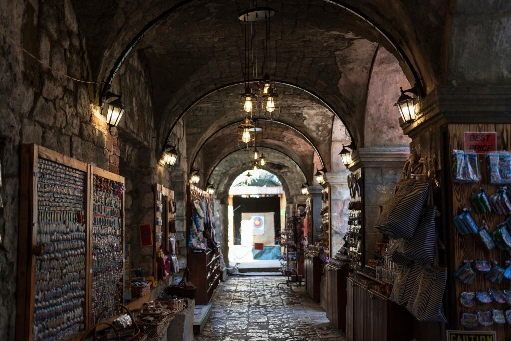 Se encuentran disponibles alimentos típicos, incluidos quesos y licores locales, pero la mayor parte del espacio está dedicado a los esperados imanes de nevera, llaveros con temas de gatos y lámparas coloridas, probablemente demasiado caras, de estilo otomano. Aún así, vale la pena dar un breve paseo para apreciar la arquitectura.