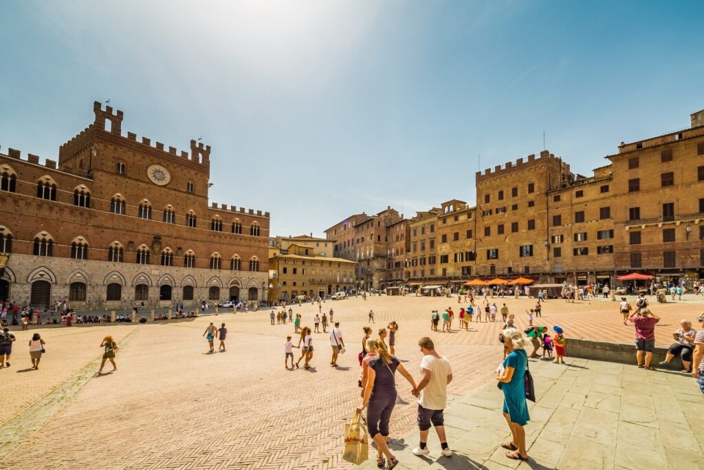 Una de las plazas más singulares de toda Italia, la Piazza del Campo, o "Il Campo", es el centro de la vida en Siena. Su inusual forma de cola de pez y su superficie inclinada de ladrillo rojo es el lugar de celebración de todos los eventos más importantes de Siena, incluida la carrera de caballos Palio, que se celebra dos veces al año.