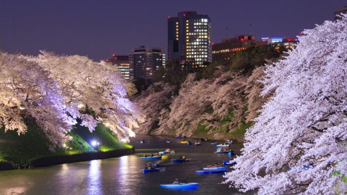 Chidorigafuchi atrae a alrededor de un millón de visitantes durante esta época, y los botes de remos son extremadamente populares para navegar entre los sakura en plena floración. Encontrarás largas colas en las estaciones de alquiler de barcos. Por la noche, hay un impresionante evento de iluminación que transforma el mar de cerezos en flor en una escena romántica y mágica. Esto ofrece una atmósfera completamente diferente del majestuoso entorno del Palacio Imperial.