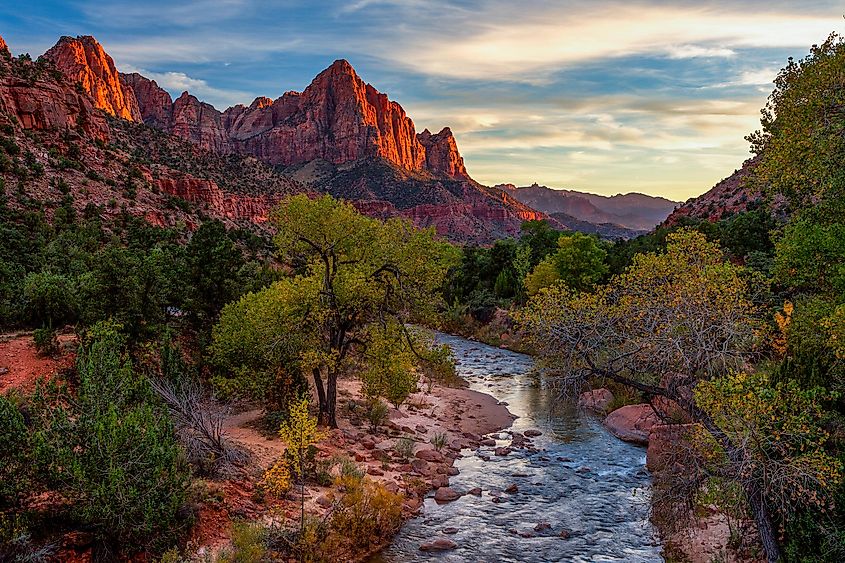 Vista de la montaña Watchman y el río Virgin en el Parque Nacional Zion cerca de Springdale, Utah.