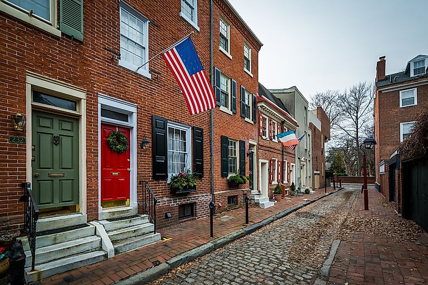 Edificios históricos de ladrillo y calles adoquinadas en Society Hill, Filadelfia, Pensilvania.
