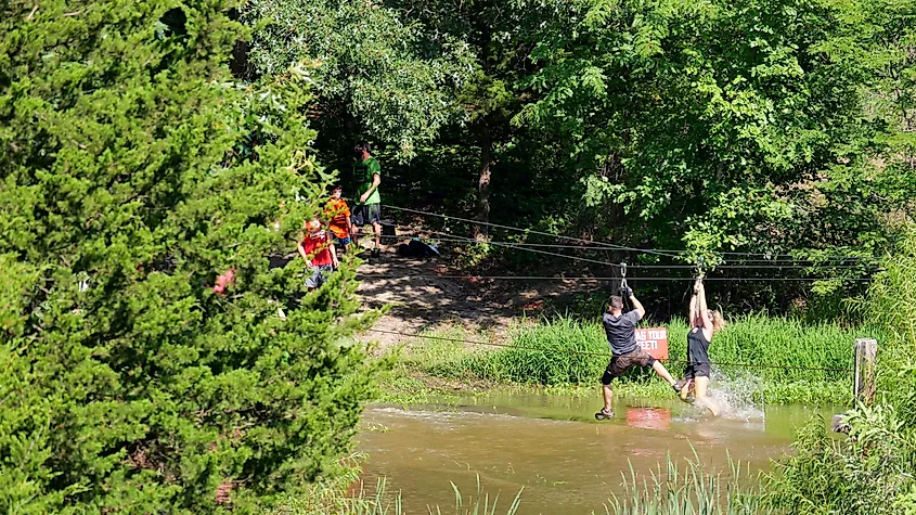 Personas haciendo tirolesa como parte del KC Timber Challenge en Bonner Springs, Kansas. Crédito de la imagen Matt Fowler KC a través de Shutterstock