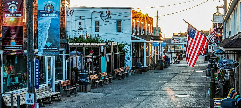 Ocean Beach, Nueva York: Vista temprano en la mañana del centro de Ocean Beach en Fire Island mientras el sol sale sobre los negocios.