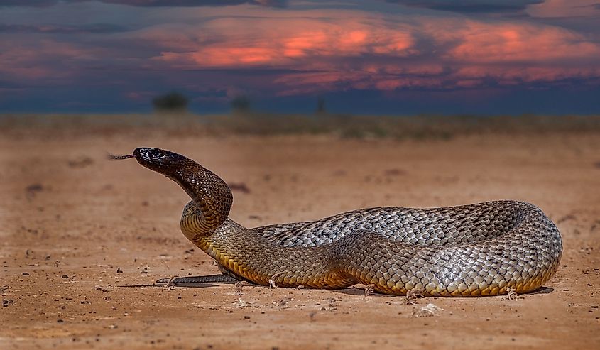 Esta serpiente solitaria, que se encuentra en las regiones áridas del interior del este de Australia, se alimenta principalmente de roedores y libera veneno letal con cada ataque. A pesar de sus mordeduras mortales, generalmente son dóciles y las mordeduras humanas son raras y ocurren principalmente con cuidadores certificados. Las picaduras suelen ser mortales sin un tratamiento antídoto inmediato, e incluso con tratamiento, pueden causar daños graves y duraderos.