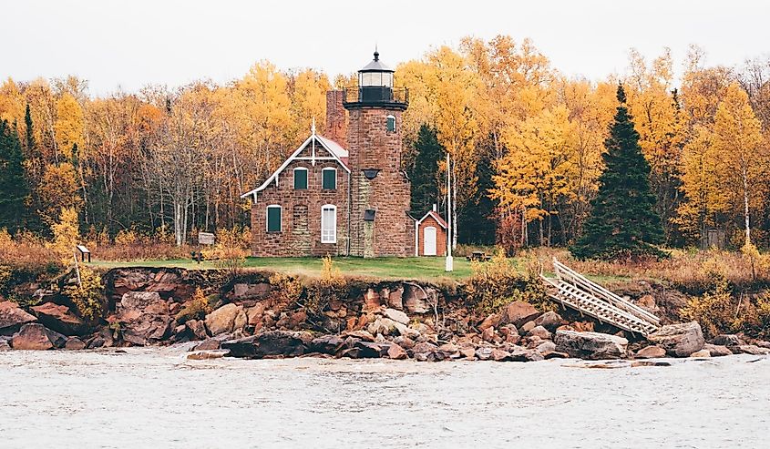 Faro de Sand Island en Wisconsin, en el Lago Superior, en la orilla del Lago Nacional de las Islas Apóstol, en otoño.