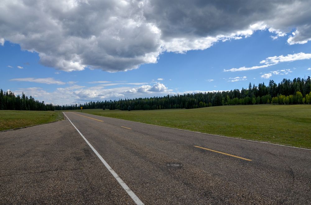 Percorso della Grand Canyon Highway (percorso AZ-67) che attraversa praterie e foreste subalpine sull'altopiano di Kaibab North Rim