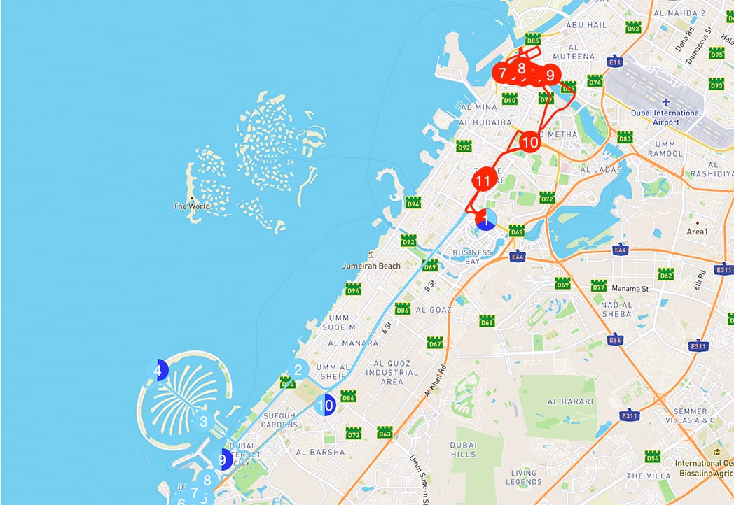 - Fermate:The Dubai Mall, Museo del futuro, Palazzo reale, Crociera su sambuco arabo, Bastakiya Old Village, Forte Al Fahidi, Old Souk, Heritage Village, Gold Souk, Spice Souk, Dubai Creek, Baniyas Road, Wafi City Mall, Dubai Frame