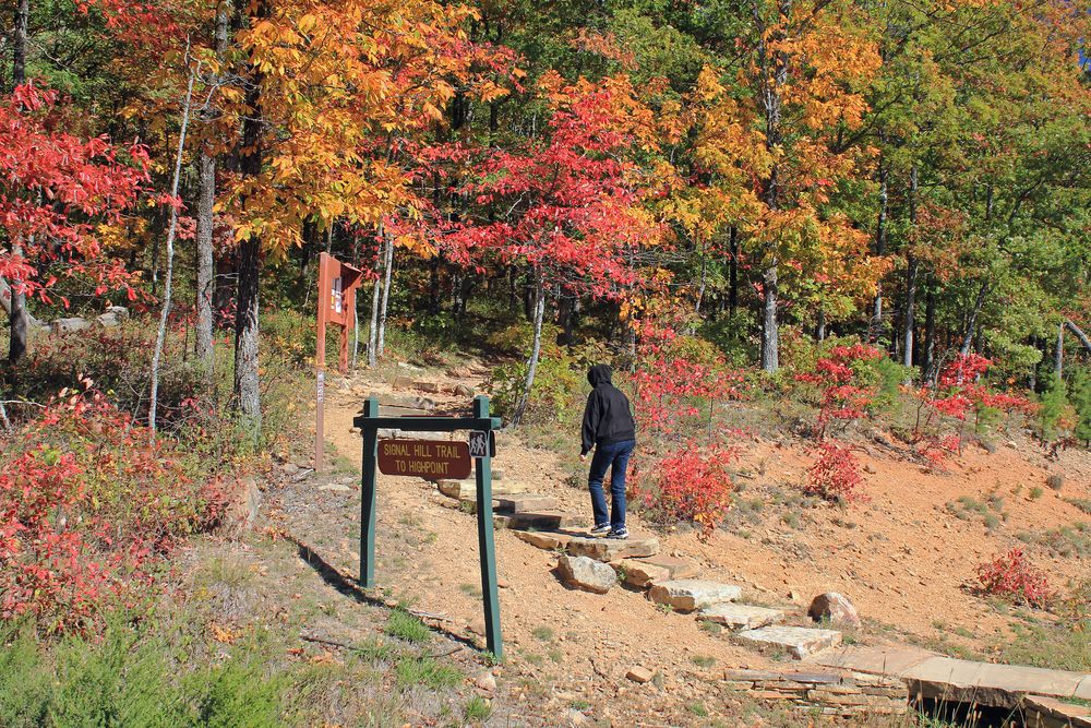 ILSentiero della collina del segnalesi trova sulla Scenic Highway 309, 17 miglia a sud di Parigi nel Mount Magazine State Park. L'autunno è il momento perfetto per l'escursione, che offre splendide viste sul fogliame ovunque.
