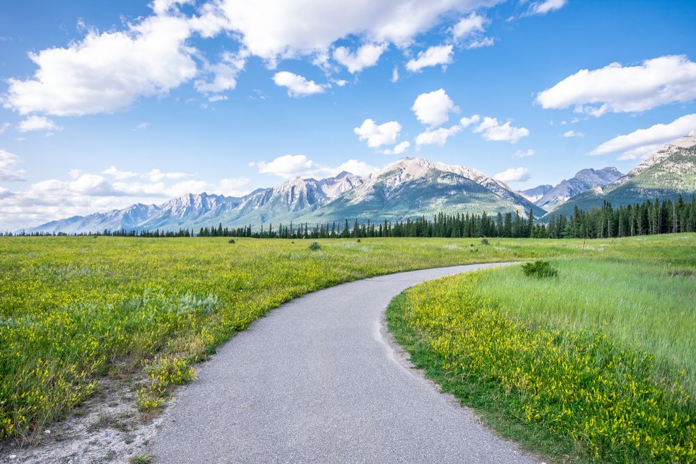 Prati fioriti, cieli azzurri e nuvolosi e un'incredibile vista sulle montagne lungo il Trans Canada Trail a Canmore, Alberta