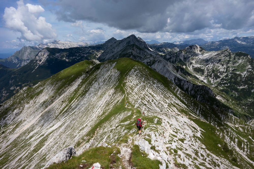 Un zaino in spalla lungo il percorso di trekking della Via Alpina nelle Alpi Giulie, Slovenia, Europa