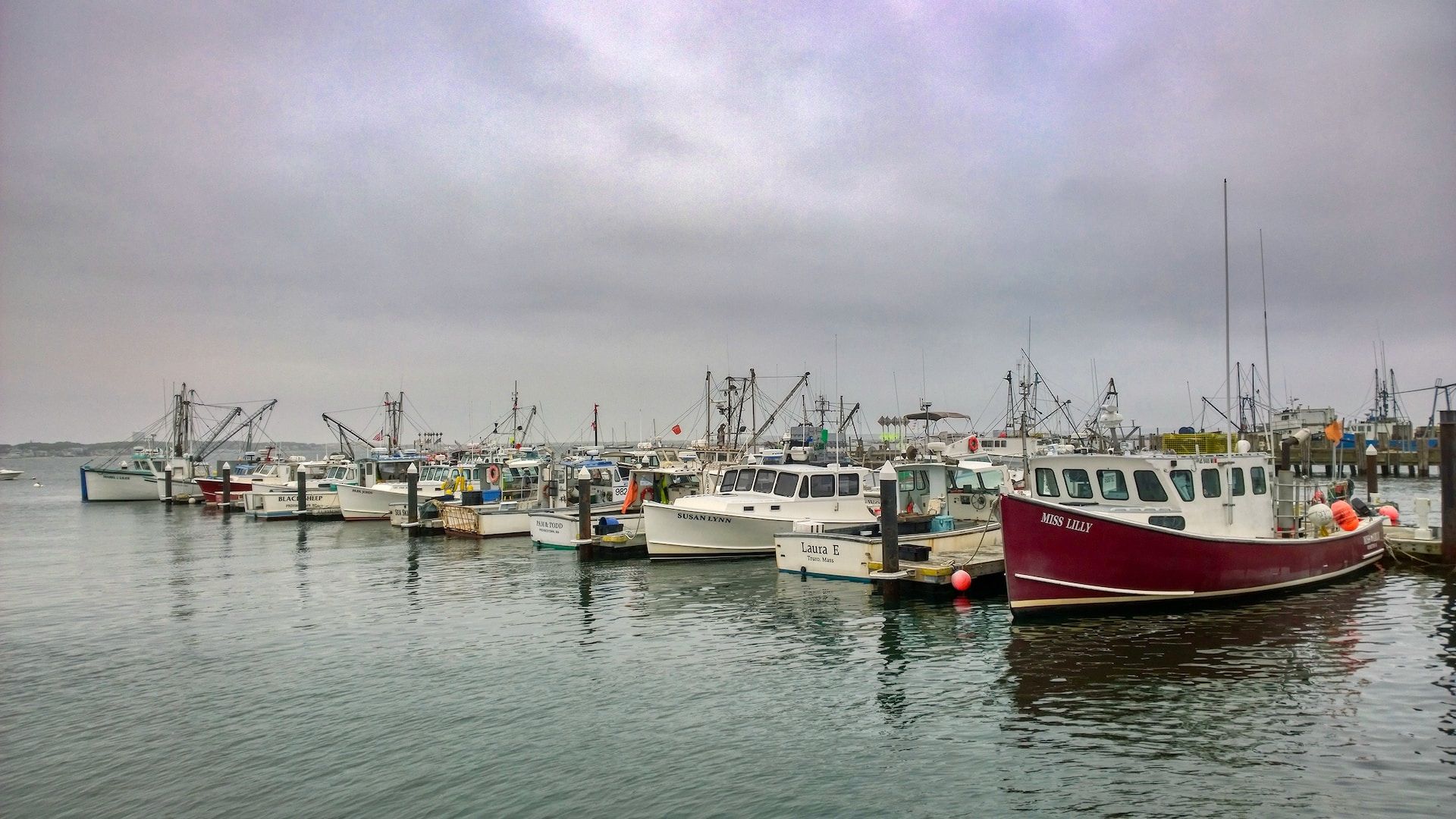 Un gruppo di barche attraccate in un porto in una giornata nuvolosa.