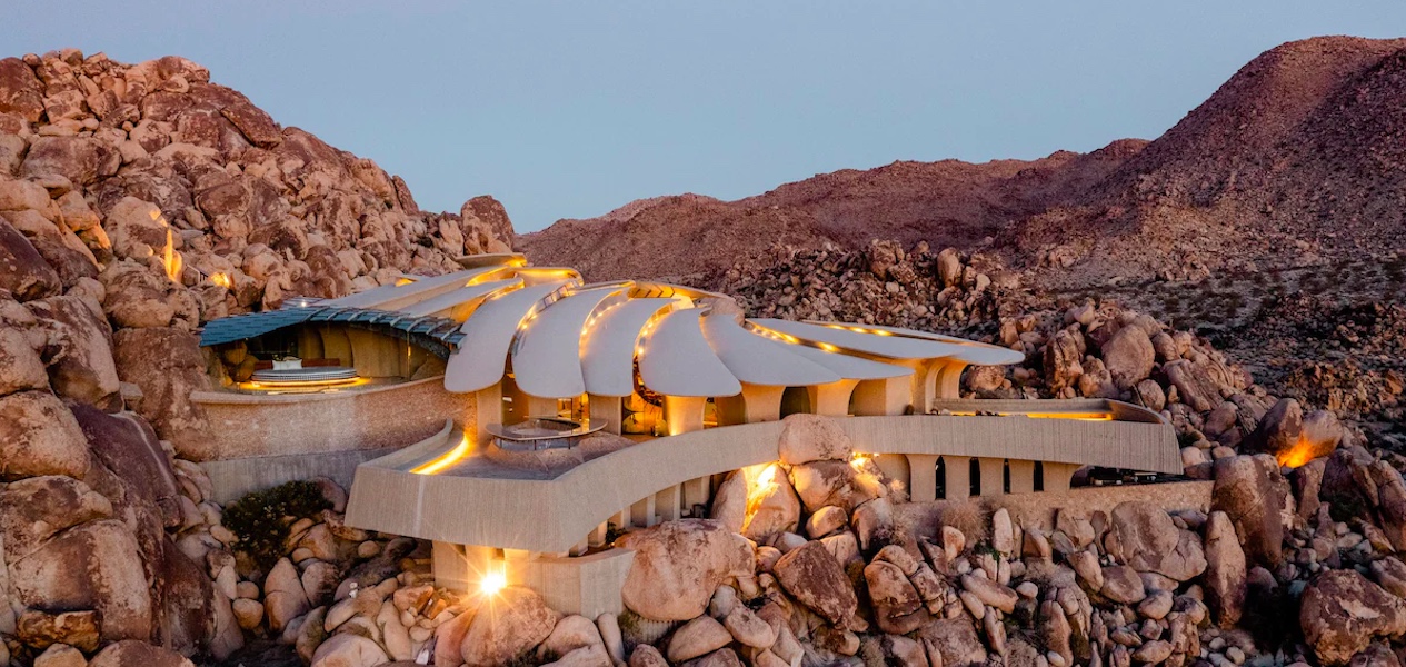 L'architettura organica è un ottimo modo per descrivere questa costruzione nel deserto del Joshua Tree... ma non riesce a trasmettere la portata di questo noleggio. È assolutamente massiccio e, ad angolo retto, sembra la cassa toracica di una creatura mammut.